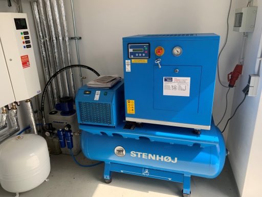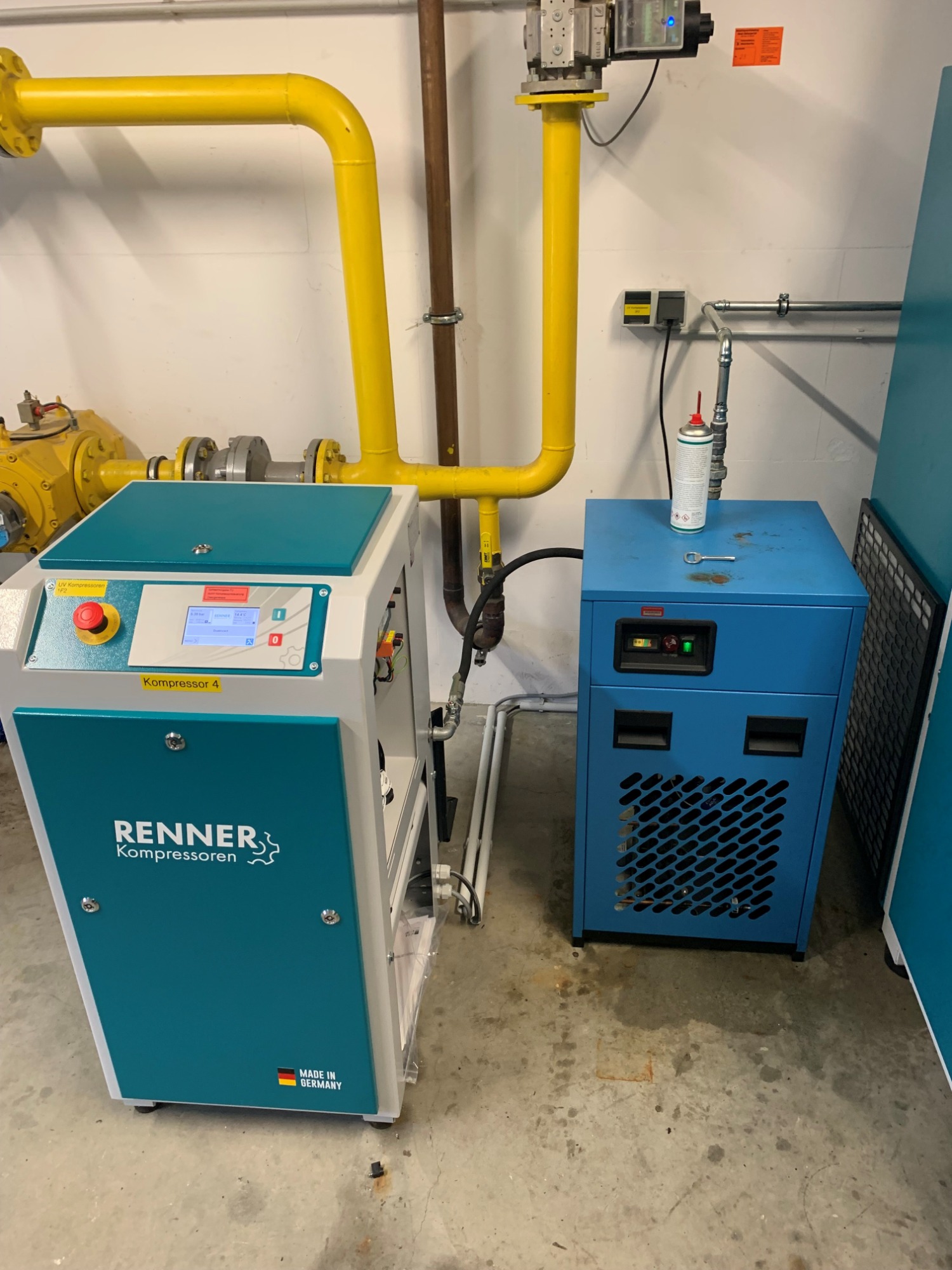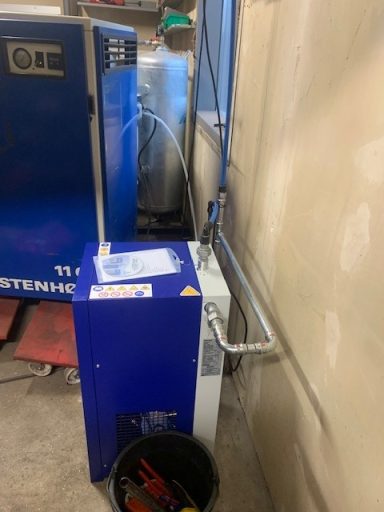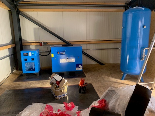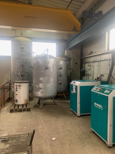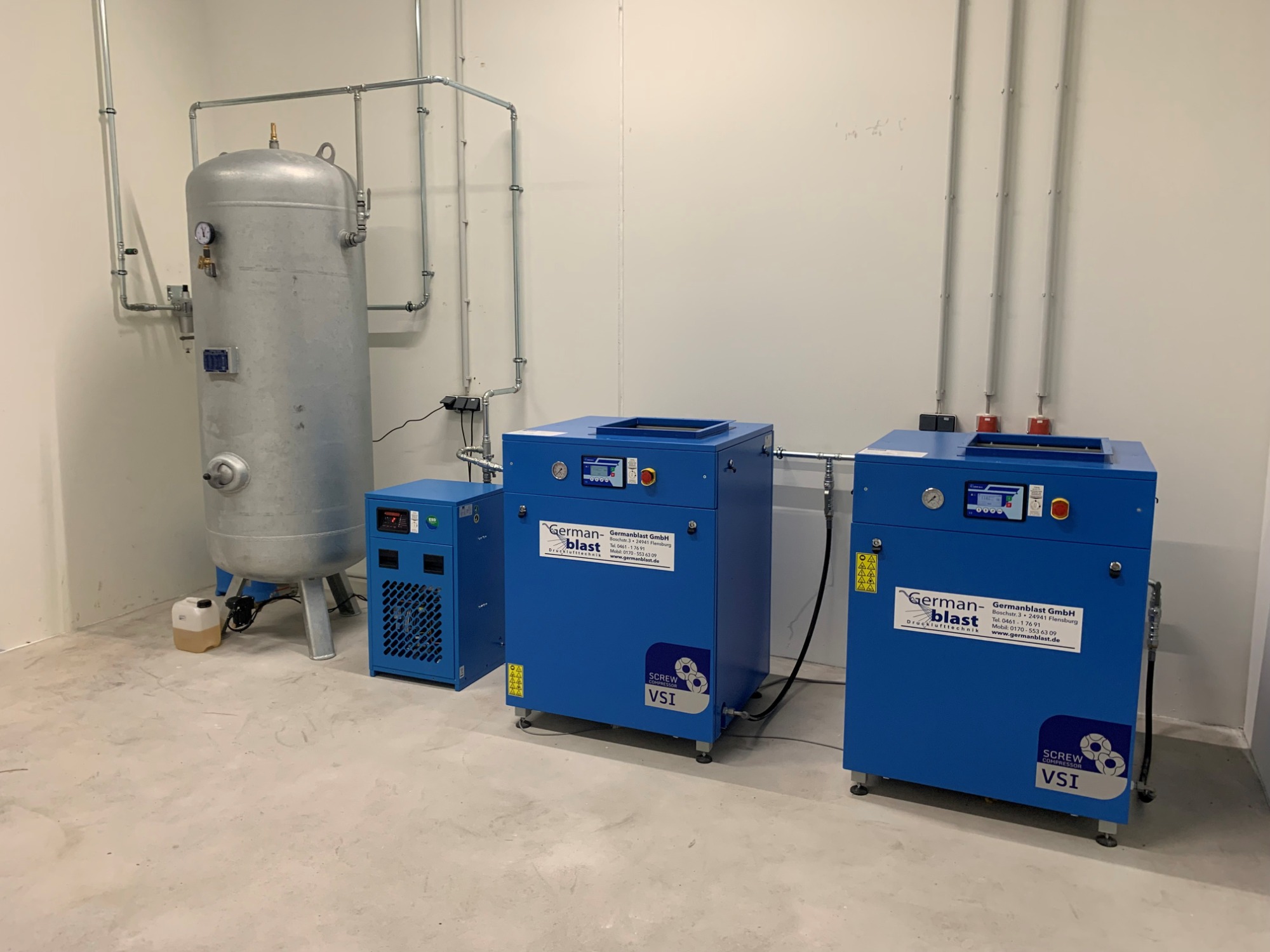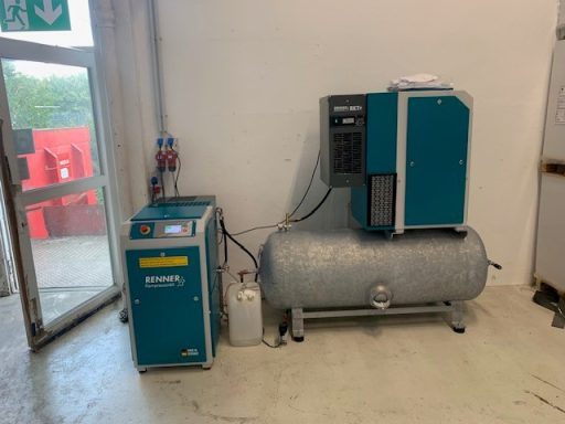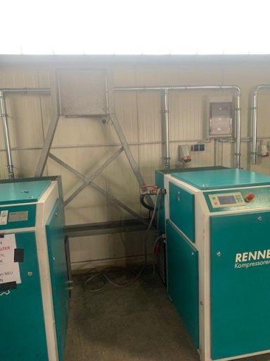 Nutzfahrzeugtechnik Köpsell Neumünster Komplett Anlage mit 2 Schraubenkompressoren, Kältetrockner, stehendem Behälter und Rohrleitung